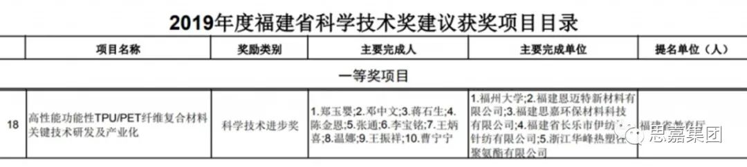 近日,福建省政府發(fā)布《關于2019年度福建省科學技術獎評審結果的公示》,福建思嘉環(huán)保材料科技有限公司與福州大學、福建恩邁特新材料有限公司、福建省長樂市伊紡達針織有限公司、浙江華峰熱塑性聚氨酯有限公司等合作研發(fā)的“高性能功能性TPU/PET纖維復合材料關鍵技術研發(fā)及產業(yè)化”項目榮獲福建省科學技術進步一等獎。